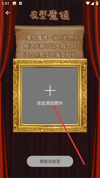 2、进入“发型魔镜”界面后,点击“点击添加照片”的区域,即可弹出照片来源选择的选项窗口。