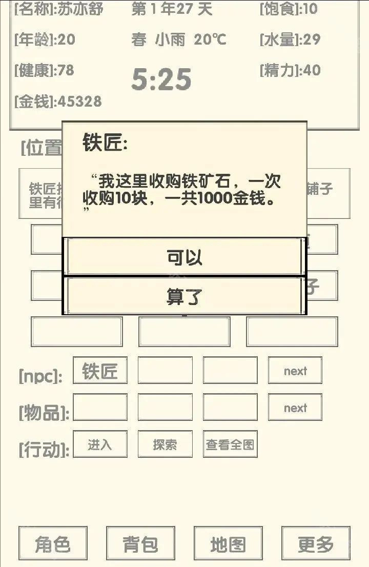 当然,还有另一条能让人发家致富的路子!去寻找矿山,点击“探索”就能发现铁矿,只要把10块铁矿卖给铁匠铺,就能赚到1000!