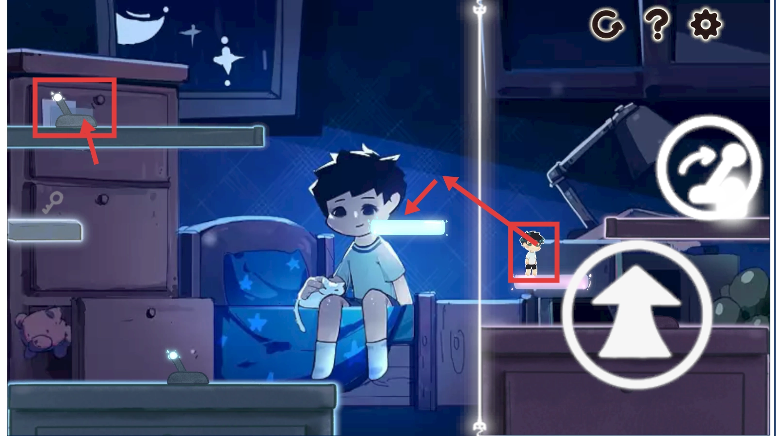 1、操控角色,利用右侧【跳跃】【移动】操作键,触发左侧机关,在房间场景中推进关卡进程。
