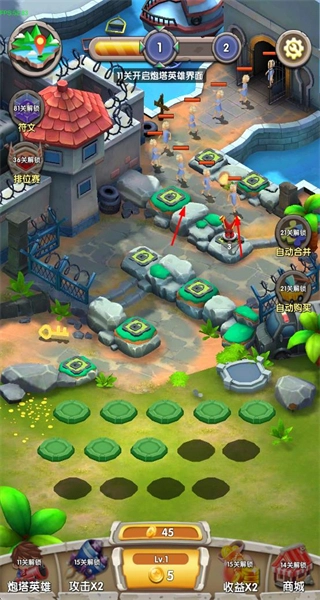 1、通过拖动合成塔防建筑,两个同等级塔可合成更高等级塔,提升防御能力。