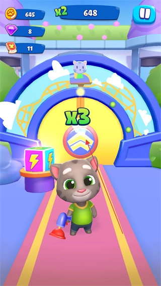游戏采用了鲜明的卡通风格,汤姆猫的造型萌趣可爱,赛道场景色彩明快,从绿意盎然的公园到充满趣味的赛道,每个场景都细节丰富,搭配轻快的音效,营造出轻松欢乐的跑酷氛围。