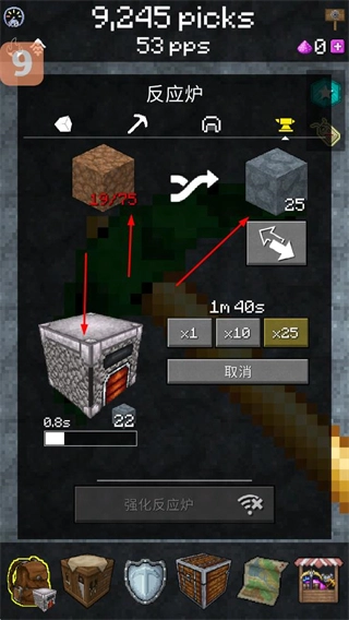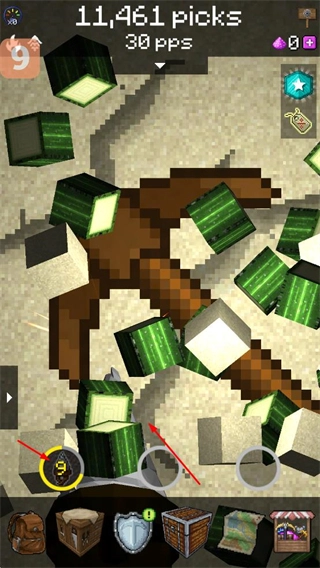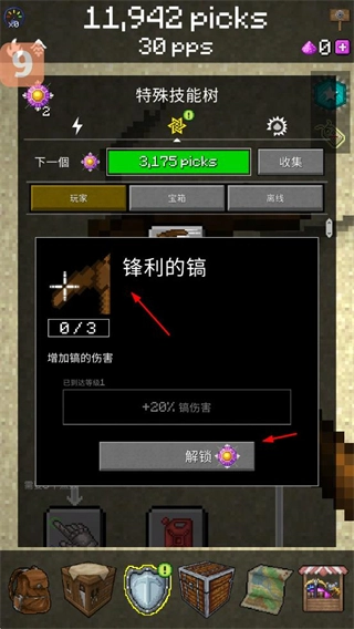 2、升级技能,消耗资源解锁技能,增加镐的伤害,提升挖矿效率。