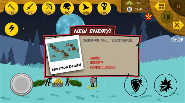 2、在动手打雕像之前,要尽快购买巨人单位,数量越多越好。雕像被摧毁后会触发一段剧情,此时会有一波攻击来收割残血士兵,而巨人往往还没移动到雕像附近。等银甲大王出现时,先让剩余的矛士顶上抗住伤害,一旦巨人开始攻击银甲大王,就立刻大量购买剑士;如果资源充足,也可以同时补充矛士。
