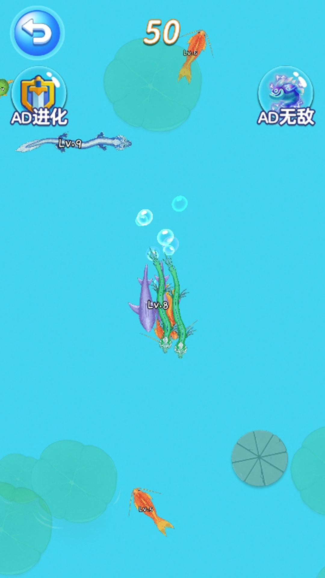 1、水域里生活着青蛙、乌龟、鲤鱼等多种多样的水生生物,它们有着各不相同的外形和特性,为玩家提供了丰富的吞噬与进化方向。