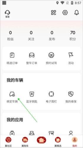 1、首先用户启动车辆后,车辆中控大屏会显示用于绑定车辆的二维码;接着用户打开凯翼汽车APP,完成注册登录操作后,进入【我的】页面并点击【绑定车辆】选项。