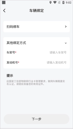 3、若车辆中控大屏未显示绑定车辆的二维码,用户可点击上图页面中的【其他绑定方式】,在新打开的页面里,通过输入车架号与发动机号完成车辆绑定。