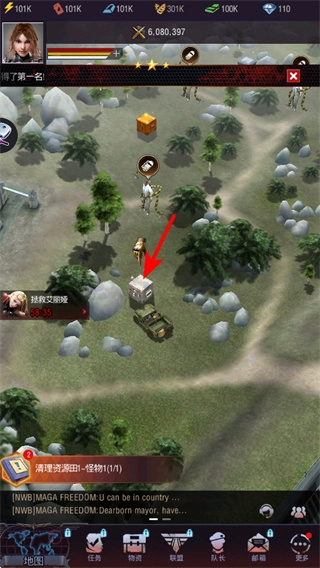 4、点击地图上的资源点如车辆,可派遣部队清理资源获取收益,这是积累资源的关键策略,关注资源点的类型强度。