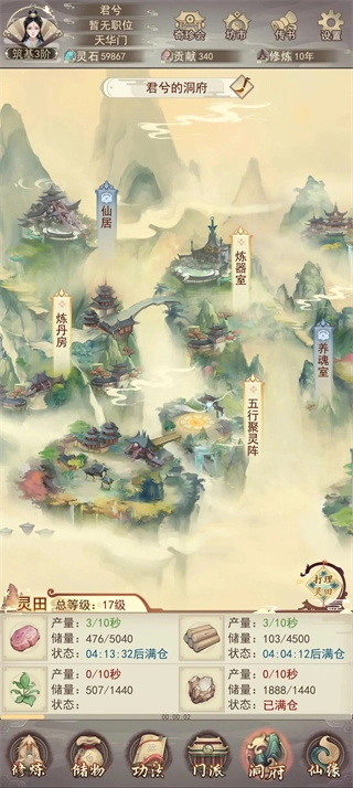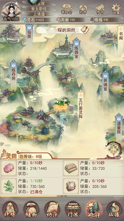 灵根的等级越高,那些对应五行属性且能获得灵根加成的功法,其效果就会越强。在聚灵阵里摆放聚灵宝物,或者安排道童上阵,都能够提升聚灵阵的灵气产出量;而在灵药园中栽种灵药,就会消耗五行聚灵阵所产出的灵气。要是聚灵阵中的灵气出现过剩的情况,还可以把灵气转化成灵石。
