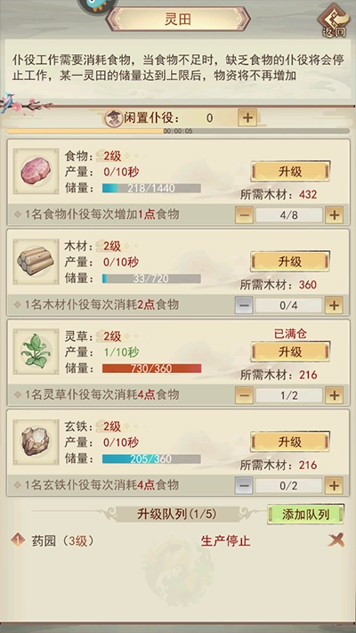 灵田内的各项设施都得安排仆役负责劳作,像兽场是产出食物的,而其他设施的仆役要开展劳作,前提是得有足够数量的仆役。要是兽场的食物产量和储量都不够了,那灵田里所有仆役就会停止劳作。林场能产出木材,药园可产出灵草,矿脉会产出玄铁。还可以借助升级队列,提前把灵田各设施的升级事宜安排好。