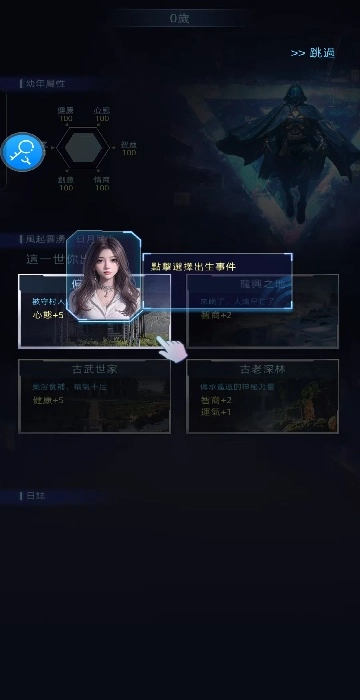 2、一开始你需要根据需求来选择出生和成长的事件,加成是不同的。