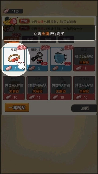 3、客人来到地摊后会呈现出不同的购物需求,玩家需要依据顾客所展示的商品图标,点击对应的货物完成售卖以获取收益,且速度越快越好,部分顾客还会连续购买多件商品。