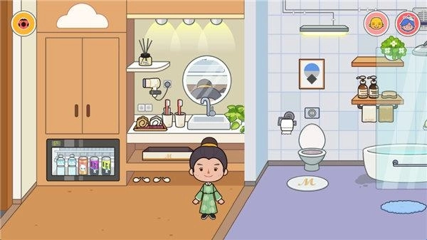 三层设有大床房,房间内的电视机、洗漱区、冲凉区等设施都能和角色进行互动,比如可以让角色去洗漱或者看电视。