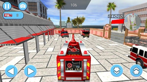 5.用左手来操控消防车的方向,右手则负责控制车辆的前进和后退。你得留意画面右上角的小地图,通过它来寻找火灾发生的地点,到达现场后,还需要完成救火的任务。
