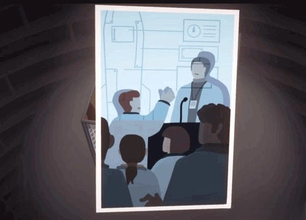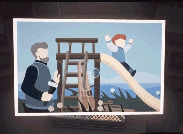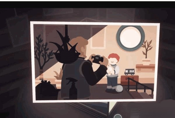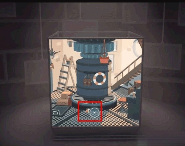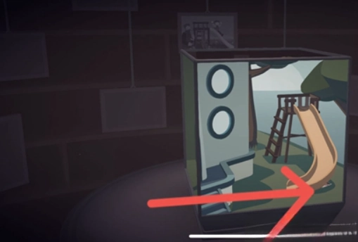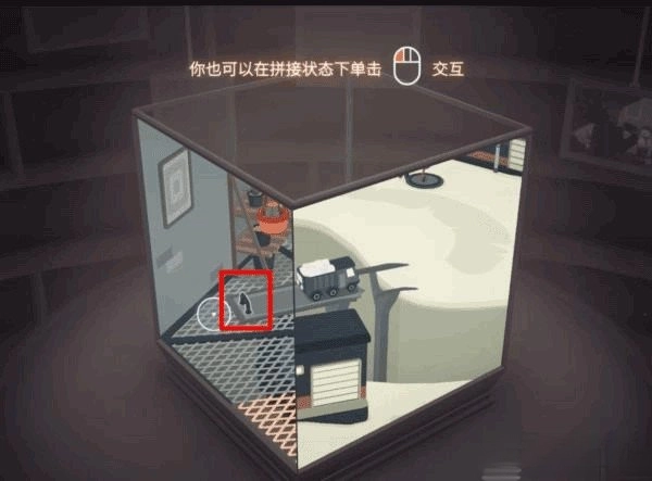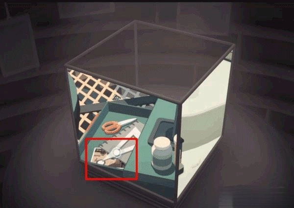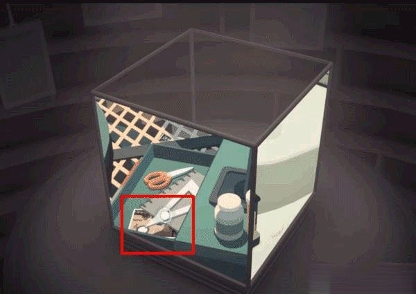 利用桌上的台灯进行拼接操作,以此抬起仓库门前地面的井盖,开启立方体上部的画面。之后在左立面里的滑梯下方就能找到这张照片。