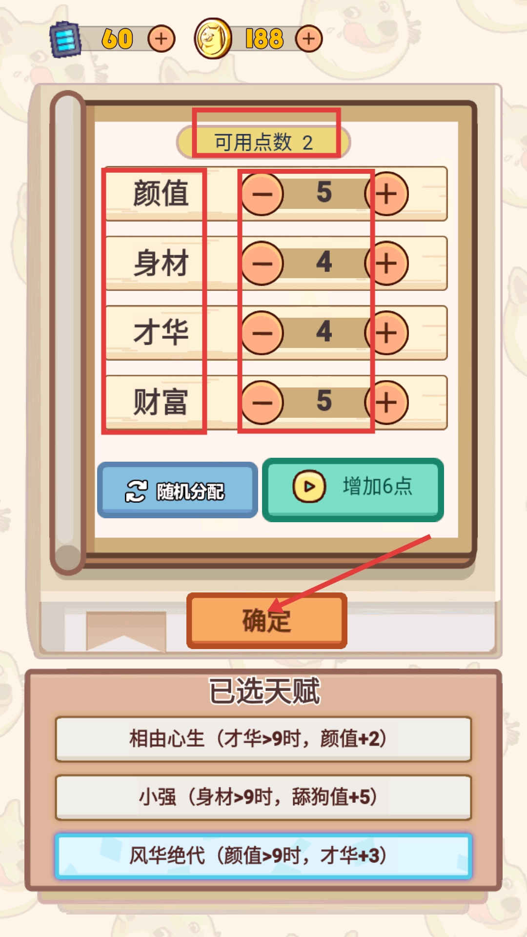2、当遇到【可用点数-2】的情况时,需结合已选定的天赋,针对性地将这些点数分配到【颜值】【身材】【才华】这几个属性上。比如,为了触发天赋效果,可以侧重提升与之相关的属性,调整完毕后点击【确定】按钮即可。