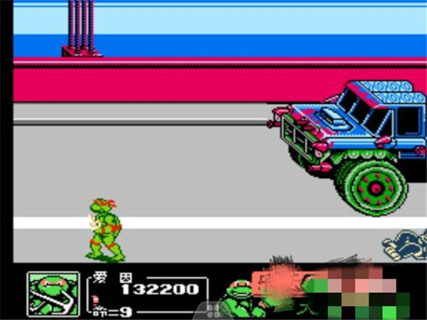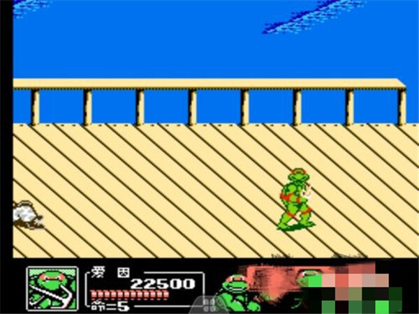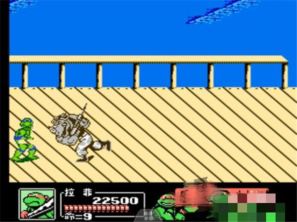 过关小技巧:这个boss的攻击伤害挺高的,当它发起冲撞的时候,千万别用飞踢技能,之后随便选一个忍者龟的技能去攻击它就行,不过通常还是得耗掉一条生命值。