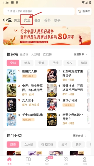 1、打开小说阅读类首页,点击顶部女生分类,进入女生小说页面。
