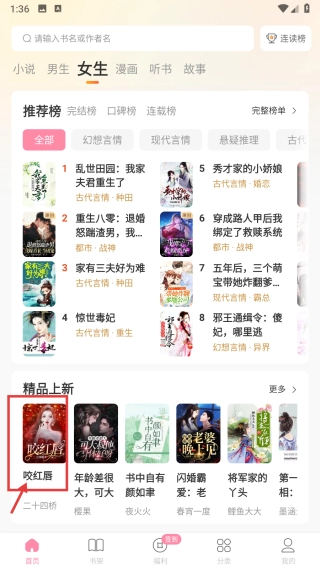 2、在女生小说页面,点击咬红唇书籍条目,进入书籍详情页面。