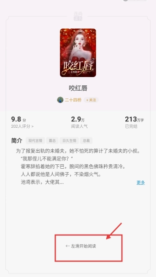 3、在书籍详情页面,左滑开始阅读,进入小说章节阅读页面。