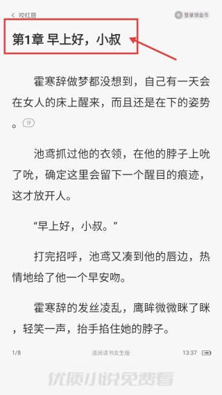 4、在小说章节阅读页面,即可查看咬红唇第1章等内容。