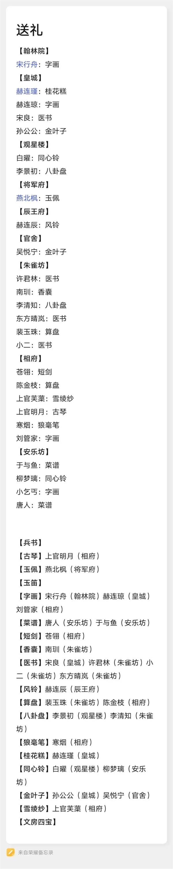建议把礼物攒到一定数量后再一起赠送,p3是我记录的部分角色的喜好以及对应的获取地点。由于我不想重复游玩多周目,所以这份记录并不完整。其中标蓝的角色都有专属剧情故事,如果想体验剧情的话,建议优先把他们的好感度刷满,特别是太子赫连瑾。不知道是不是游戏bug,他第一个剧情的奖励居然给了二十多个桂花糕。