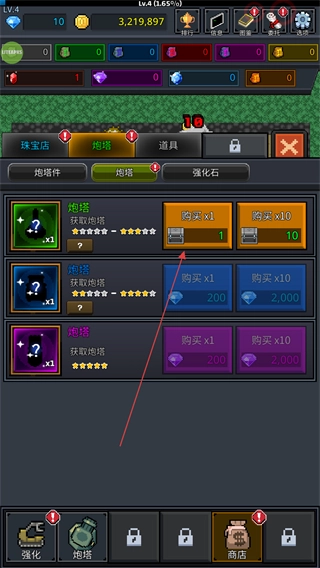 1、在商店的炮塔界面,消耗金币或钻石购买不同类型的炮塔,丰富防御阵容。