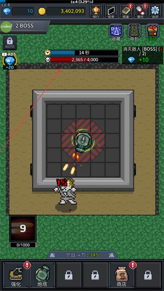 2、面对BOSS敌人时,操控炮塔持续攻击,削减其血量,注意躲避BOSS的攻击。