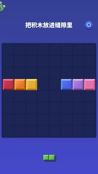 1、观察现有方块间的缝隙形状,将下方绿色双块积木拖放至红橙黄与蓝紫粉方块之间的空隙处,实现无缝填充。