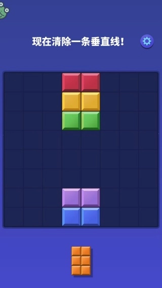 2、把下方的橙色四方块积木拖到红色、黄色、绿色方块列的右边,或者拖到紫色、蓝色方块列的左边,让它们形成完整的垂直直线,这样就能触发消除,完成关卡任务。