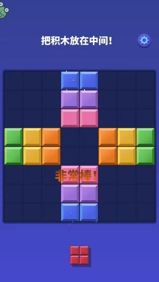 3、仔细观察中间空缺的形状,将下方红色积木精准拖放至中间空白区域,完成填充。