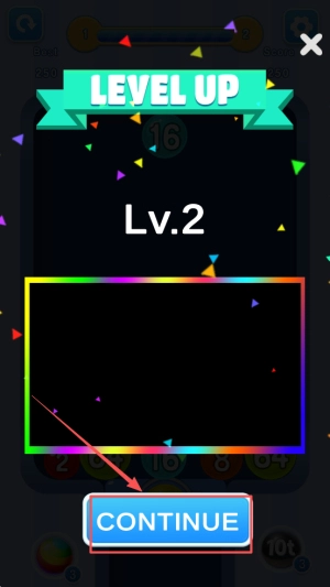 4、升级继续:当界面显示“LEVEL UP Lv.2 CONTINUE 1ot”时,点击“CONTINUE”按钮即可进入下一级。