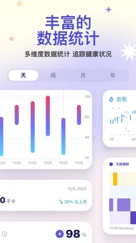能够对相关的数据来进行多维度的统计分析,全面追踪用户的健康状况,轻松管理健康。