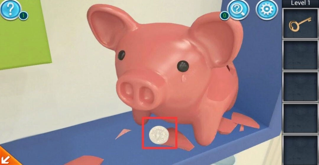 4、点击门的左侧架子,用锤子将小猪存钱罐摆脱,可得到钱币。