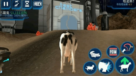 1、玩家抵达试验室后会领取任务,进入试验室内部,在这里需要完成四个实验,第一步是踩下中间的蓝色按钮,随后会有一头牛掉落下来。