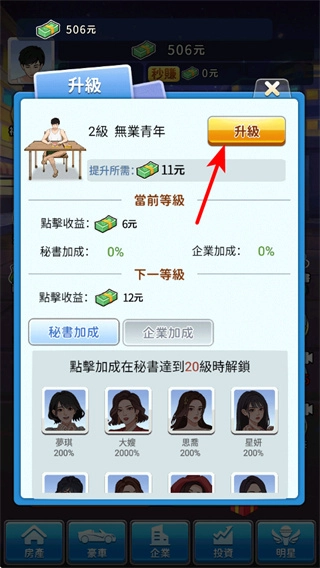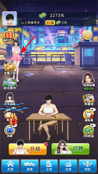 3、点击场景中的秘书角色,可触发互动获取收益加成,这是提升赚钱效率的辅助技巧,需要及时与秘书的互动。
