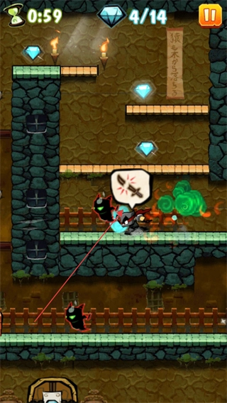 1、操控忍者躲避火焰陷阱,收集场景中的钻石,当前目标为收集14颗钻石,注意计时。