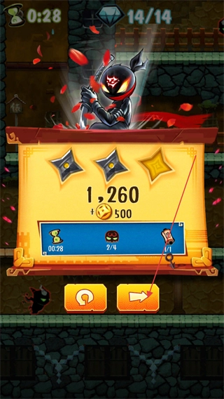 4、收集满14颗钻石后,触发结算界面,点击箭头按钮进入下一关。