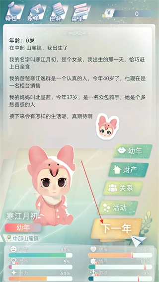 1、打开当代人生游戏,在角色出生时开始游戏,点击下方的下一年按钮增长岁数。