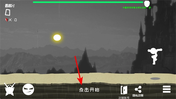 1、进入游戏后,点击红色箭头指向的点击开始按钮,可启动游戏关卡,这是开启冒险的关键操作。