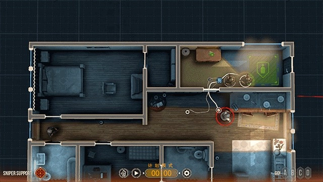 游戏的核心特色在于对战术规划与团队配合的强调,这些战略部署的制定依托于一块形似篮球场战术板的【战术布置界面】。玩家能够在此分析局势、规划队伍行进路线,战斗细节可细化至狙击、掩护、开锁、爆破等每位队员的具体任务。点击队员即可查看其技能,还能为队员下达移动路线指令,并将指令设定为A、B、C、D等步骤分步执行。