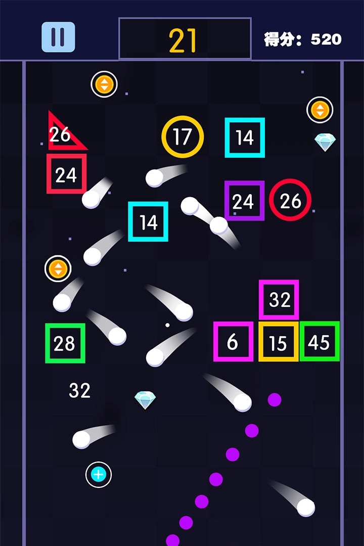 3、每次弹珠击打一次方块都会获得分数,在方块到达底端前尽可能的获取高分。