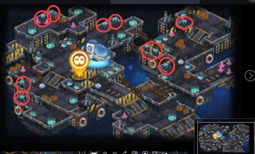 不过,激活房间得用到芯片。我们可以依据剧情任务的提示,去收集地图上会出现的芯片。按照之前提到的偷懒办法,收集7个芯片就足够了。下面这张图展示的是能采集到芯片的大致区域,因为这次小地图打开后分成了三个区域,所以原图有点小。为了让大家看清楚采集区域,我特意把图放大了,所以看起来会有些模糊。