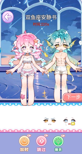 3、以双鱼座安静书为例,首先为两个角色搭配适配的眼睛,确定面部基础形象后点击下一步。