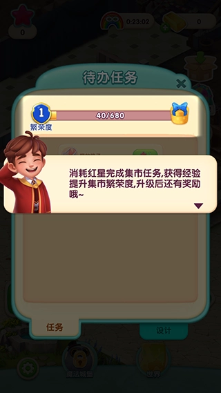 2、游戏中主要目的是通过完成关卡获得红色心心,消耗红心可以完成集市任务获得经验提升繁荣度奖励等。