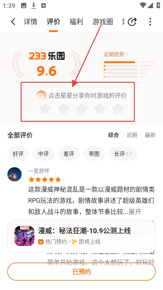 2、进入评价页面后,我们可以点击星星,给游戏进行星级评价,表达对游戏的看法。