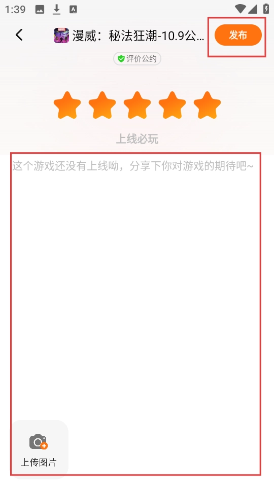 3、选好星级后,我们在输入框中写下对游戏的期待等内容,然后点击【发布】,就能提交自己的评价啦。