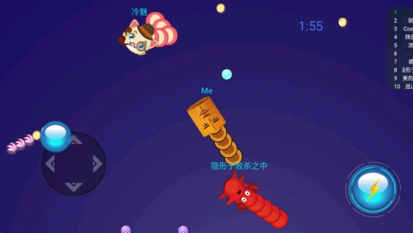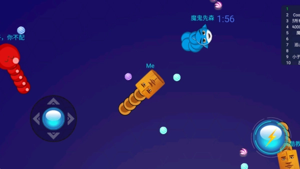 3、你可以自由控制蛇的移动,避开四周的墙壁,吃掉那些比你短的小蛇,让自己变得更强大。