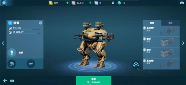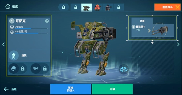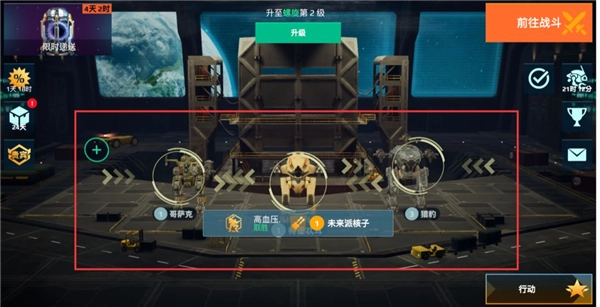 占据主界面C位的是现有并出战状态下的机甲,指挥官可以点击机甲进入机库,进行更换、升级以及替换装备等操作。