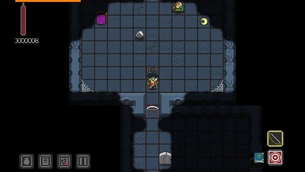 1、打开地牢探索者手机汉化版游戏,进入战斗界面,可看到右下角弓是攻击/移动,靶是技能,书是魔法书,这三个样式会跟角色的不同而改变,功能是一样的。