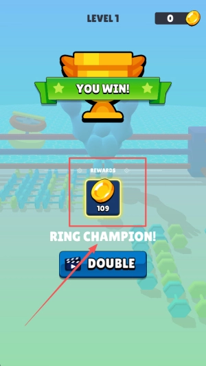 4、胜利领奖:界面会显示“LEVEL1 YOU WIN! 109 RING CHAMPION!”,点击“DOUBLE”按钮可让奖励翻倍。